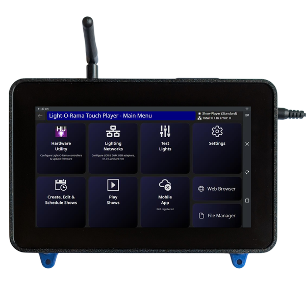 The Light-O-Rama Touch Player allows a user to control their light show without a personal computer. It can play shows without music or synchronize the lights to audio or video media. Audio can be output to a 3.5mm audio jack or Bluetooth. Video can be output to a full-sized HDMI port. User input is performed via the high resolution 7” touch screen display. From here, users can configure controllers and networks, test lights, and set up and play shows.